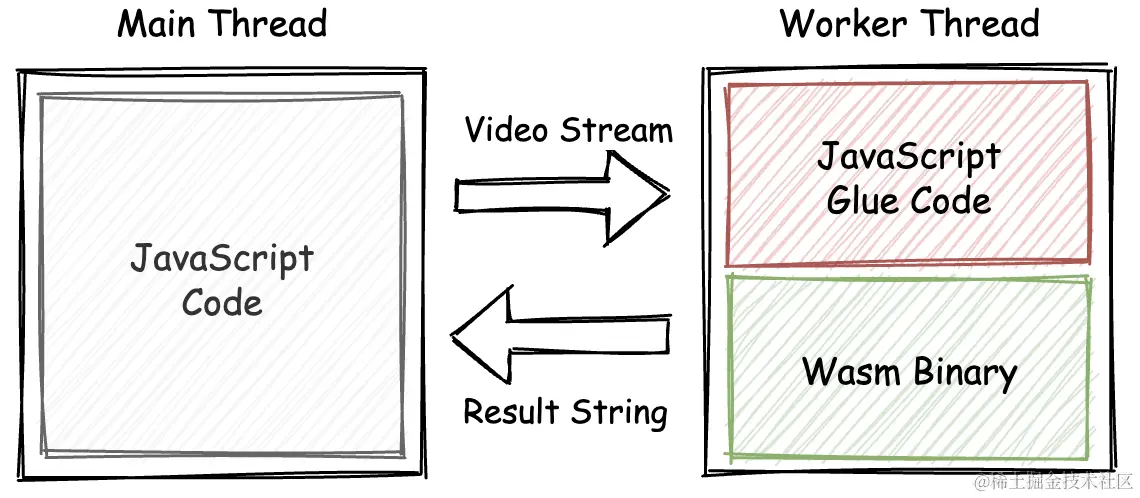 - 主线程将从摄像头获得到的视频流数据传递给工作线程,工作线程将会调用从 Wasm 模块实例中导出的特定函数,来处理这些视频流像素。函数在调用完成后,会返回识别出的 UPC 字符串或者返回空字符串,以表示没有检测到有效的条形码内容;