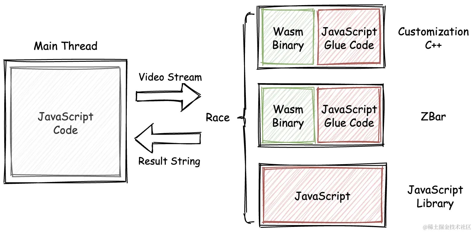 无独有偶的是,当尝试把 JavaScript 版本的条形码扫描器实现同样作为工作线程,加入到竞争“队列”中时,整个应用的条形码扫描识别成功率达到了将近 100%。这样的结果让人感到惊喜。应用的最终架构可以通过下图很好地进行展示。