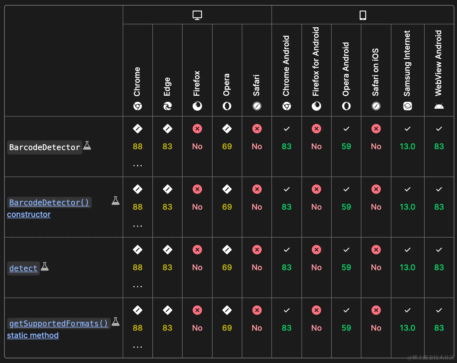 WICG(Web Incubator Community Group,Web 孵化社区群组)曾提出的 “Shape Detection API” 提案。这个提案提出了一系列的 API,可以让 Web 平台应用直接利用硬件加速或者系统相关的资源,来支持如人脸识别、条形码识别等功能。但该提案目前仍处于起步阶段,要实现跨浏览器的兼容性还有很多路要走。