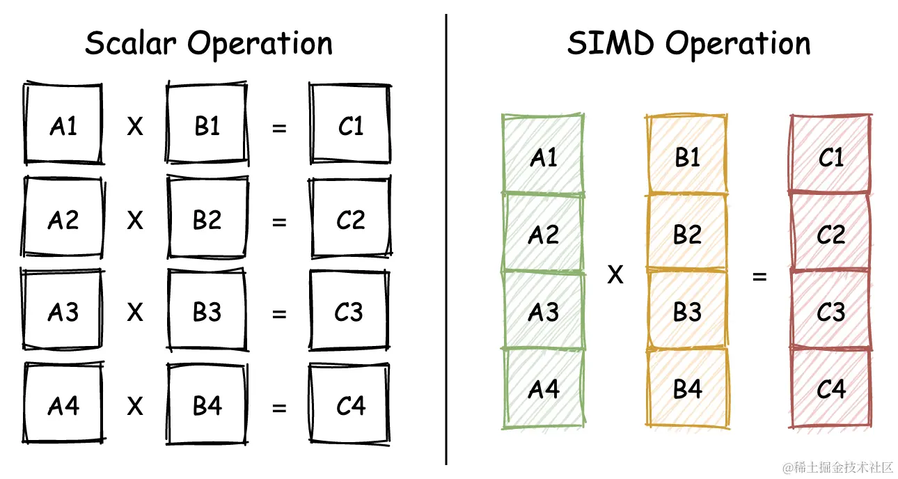 在左侧的“标量乘法运算”中,针对每一个乘法操作(An x Bn),需要使用一条独立的乘法操作指令来执行,因此对于这四组操作,便需要使用四条指令。而在右侧的 SIMD 版本中,针对 A1 到 A4 这四组乘法运算,可以仅通过一条 SIMD 指令,就能够同时完成针对这四组数字的对应乘法运算。相较于普通的标量乘法运算来说,SIMD 会使用特殊的寄存器来存储一个向量中的一簇数据,然后再以整个“向量”为单位进行运算。因此,相较于传统的标量计算,SIMD 的性能会有着成倍的增长。