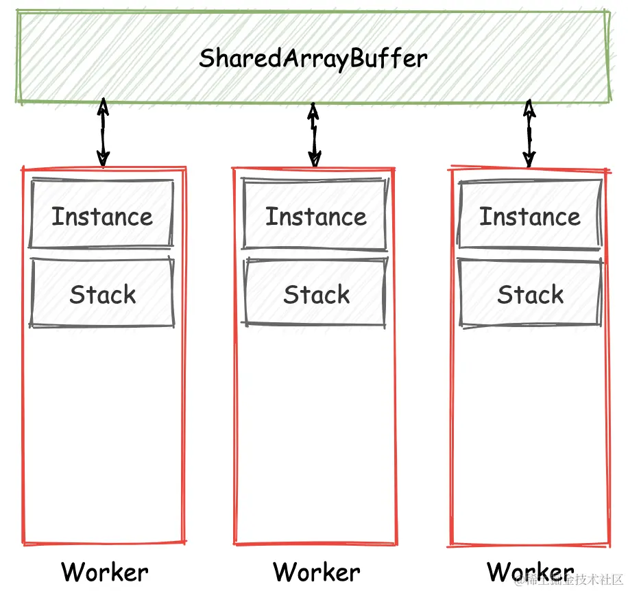多线程模式: 每个 Worker 线程都将会实例化自己独有的 Wasm 对象,并且每个 Wasm 对象也都将拥有自己独立的栈容器用来存储操作数据。如果再配合浏览器的 “Multi-Cores Worker” 特性,我们便能够真正地做到基于多个 CPU 核心的 Wasm 多线程,而到那个时候 Wasm 应用的数据处理能力便会有着更进一步的提升。
