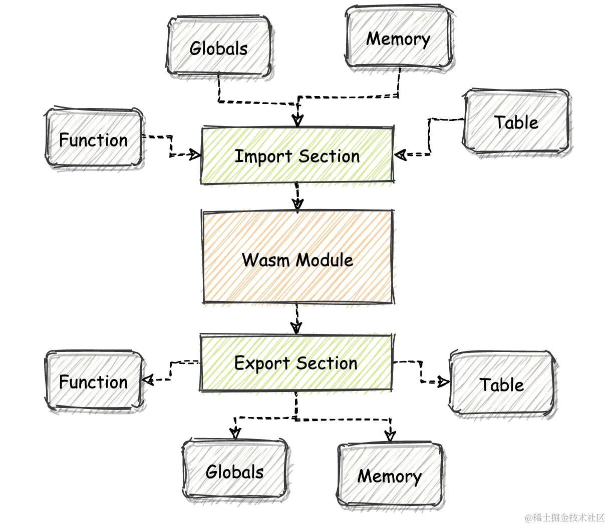 允许被导入到 Wasm 模块中的资源包括:函数(Function)、全局数据(Global)、线性内存对象(Memory)以及 Table 对象(Table)。那为什么要设计 Import Section 呢?其实就是希望能够在 Wasm 模块之间,以及 Wasm 模块与宿主环境之间共享代码和数据。与 Import Section 类似,既然我们可以将资源导入到模块,那么同样地,我们也可以反向地将资源从当前模块导出到外部宿主环境中。