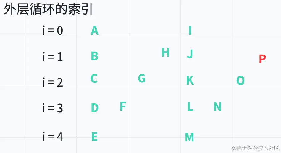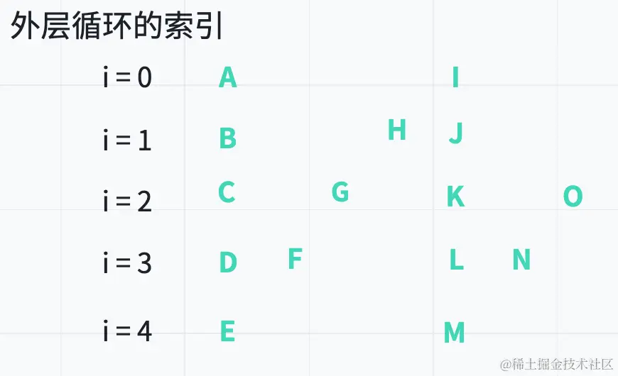 当第一层循环 i = 0时,第二层循环则要遍历所有字符,以获取 A、I