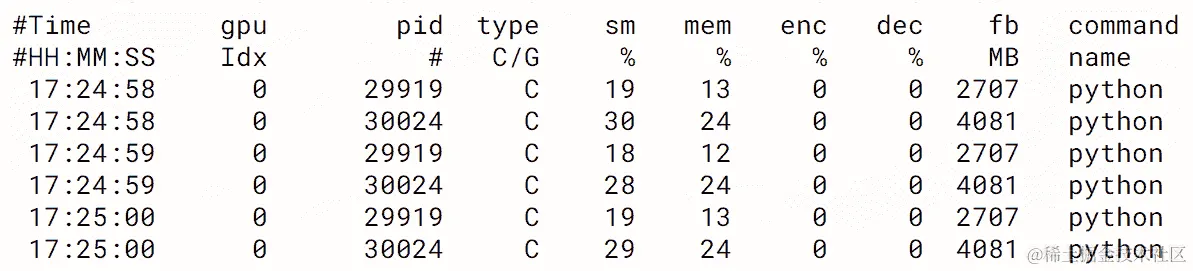 如果您在单个 GPU 上使用多个进程操作,可以考虑使用这个命令。这个命令收集 GPU 统计信息,以及它们正在使用的进程。这意味着您可以确定哪个进程被 GPU 共享限制,内存时序的空间等等: