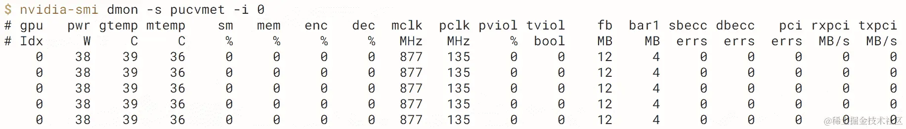 $ nvidia-smi dmon -s pucvmet -i -0