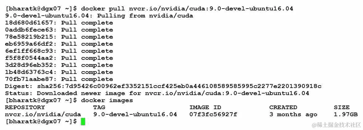 正如您所看到的,Docker 使用基于层的方法。CUDA 容器是在 Ubuntu 的基本层上构建的。此外,Docker images 命令向我们展示了我们机器上本地拉取的容器。