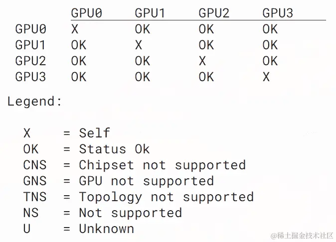 点对点访问是可伸缩性或操作的重要因素。这个命令可以帮助您确认 GPU 和您的系统是否支持 GPU 之间的点对点访问。