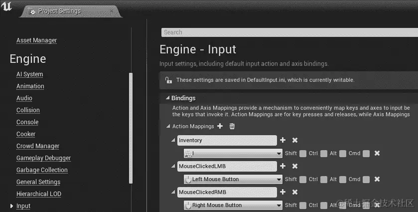 在引擎 - 输入下,添加一个右键鼠标按钮的操作映射,如下面的屏幕截图所示: