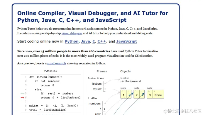 - Python Tutor 是一个交互式在线学习平台,可以可视化执行 Python 代码并显示变量值的变化,帮助理解代码执行过程。
