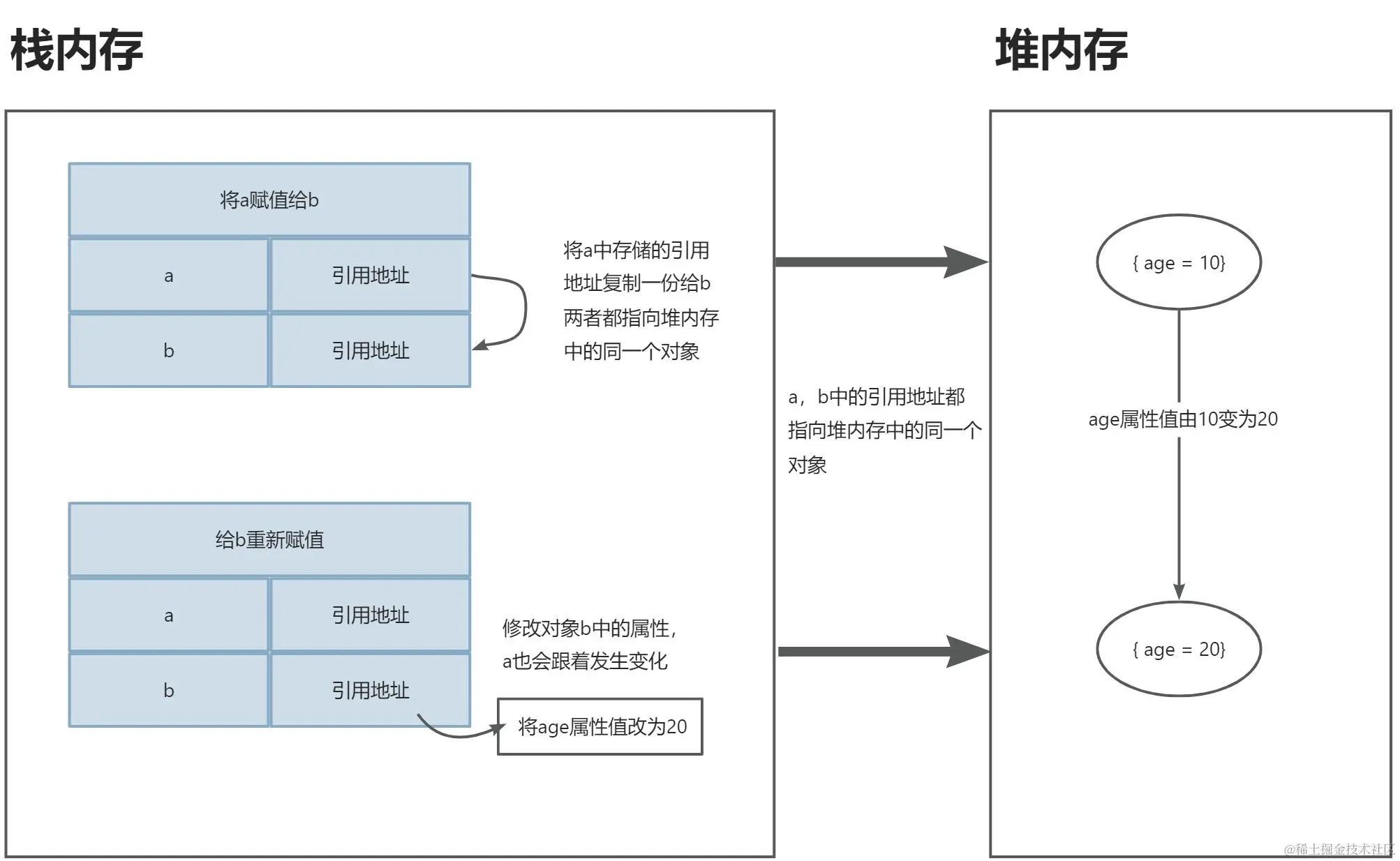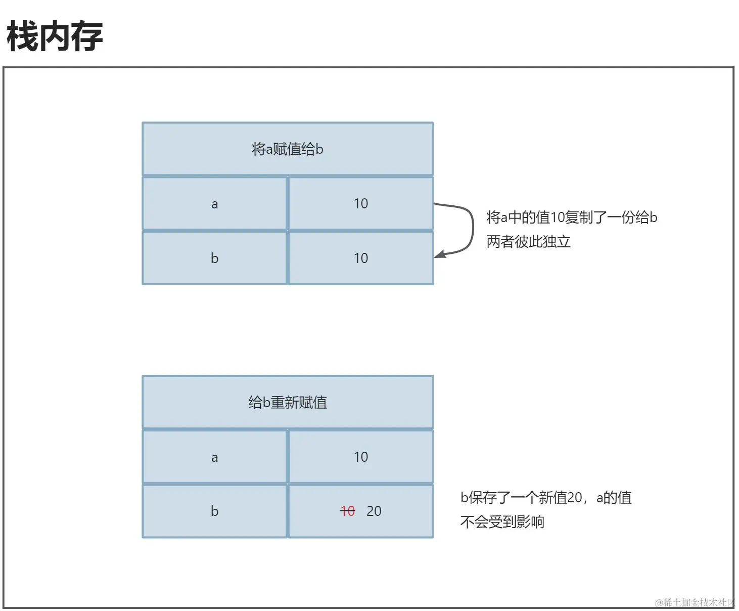 这里就进行了一次基本数据类型的赋值操作,将变量a中的基础数据类型值10复制了一份放到了变量b中。此时虽然a、b中的值相同(都是10),但它们是相互独立的,因此修改其中一个变量的值并不会影响到另一个变量。
