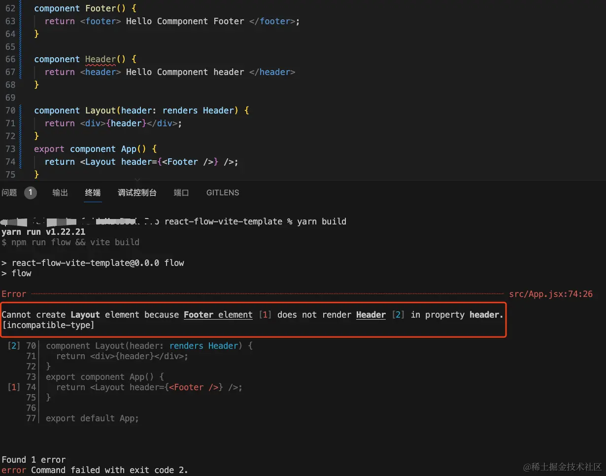 当我把 Footer 组件传递给 Layout 后,就会报错 “Cannot create Layout element because Footer element [1] does not render Header [2] in property header. [incompatible-type]”