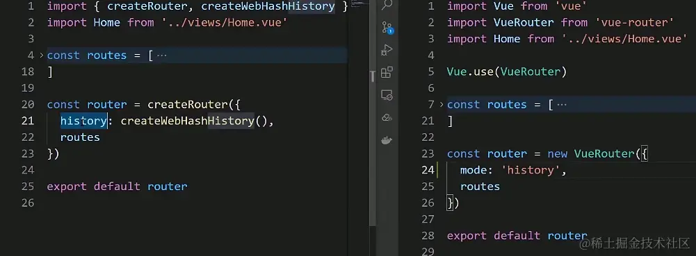 上面的代码中,我们首先引入了createRouter和createWebHashHistory两个函数。createRouter用来新建路由实例,createWebHashHistory用来配置我们内部使用hash模式的路由,也就是url上会通过 # 来区分。
