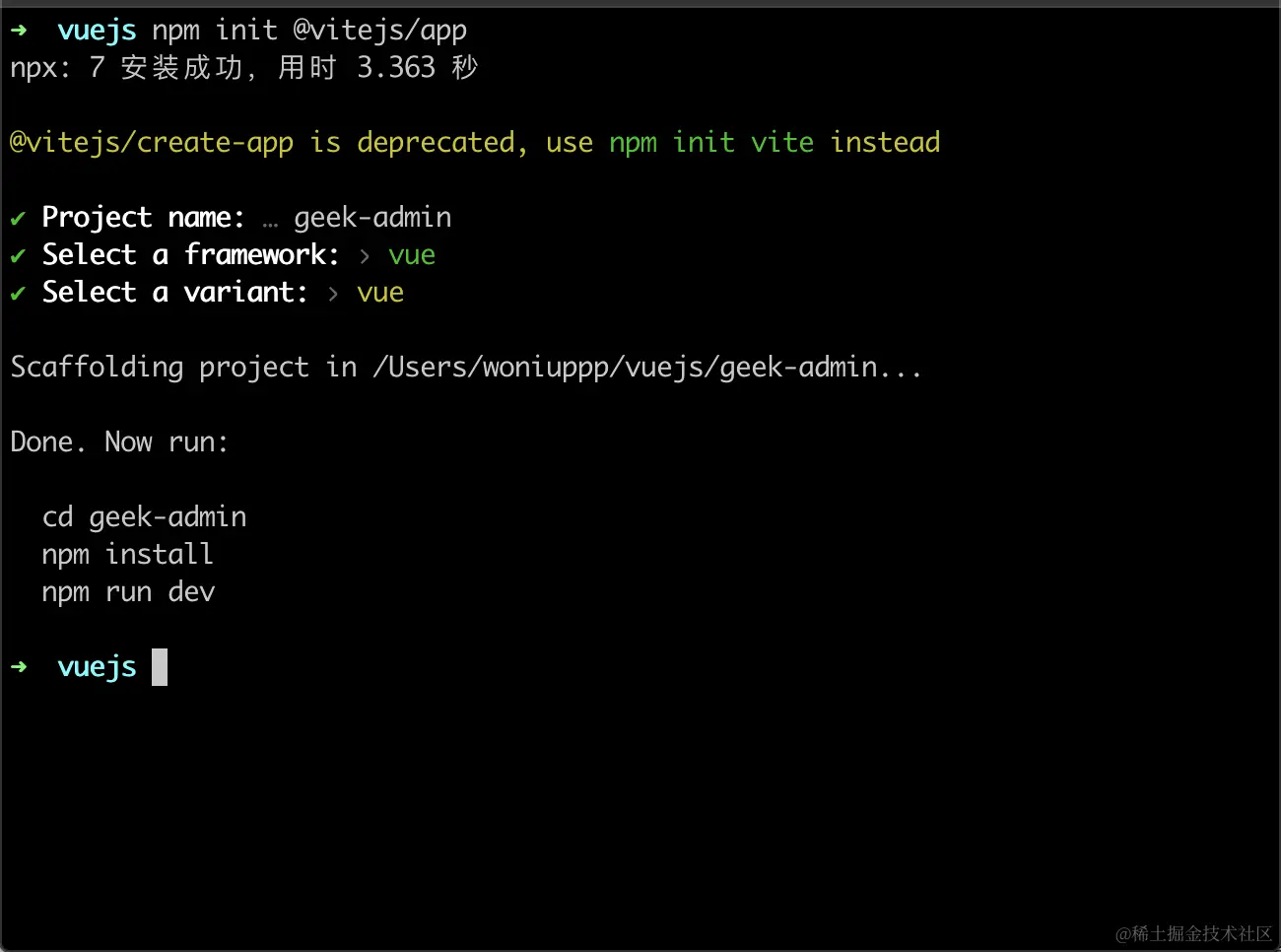 之后,在Project name这一行,我们输入项目的名字,例如geek-admin;接着,在Select a framework这一行输入框架的名字,这里我们选择vue;再之后,在select a variant 这一行,因为在项目里,我们没有选择TS,所以这里我们依然选择vue即可。