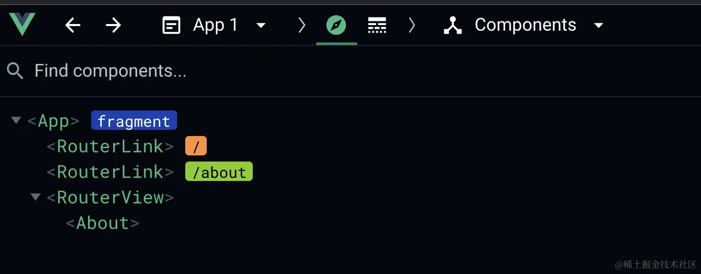 我们打开Chrome的调试窗,这也是我们以后常用的调试页面,在Vue这个标签页中,能很清晰地看到组件的层级关系。