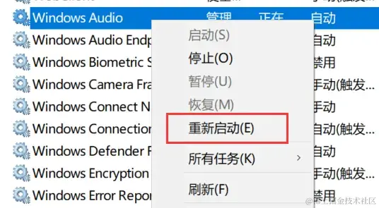 (3)右键单击【Windows Audio】服务,选择【重新启动】,等待服务重新启动后,检查电脑的声音是否恢复正常。