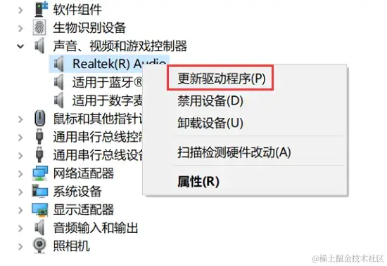 (4)右键点击有问题的音频设备,选择【更新驱动程序】,可以选择自动搜索更新的驱动程序,也可以手动指定驱动程序文件。
