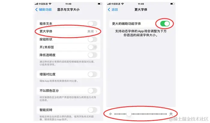 (2)在**【更大字体】界面中,启用【更大的辅助功能字体】**开关。启用后,我们根据滑块来设置调整苹果手机中的字体大小。