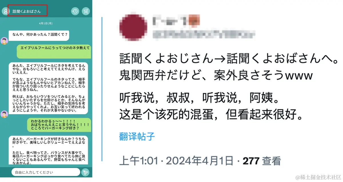 此外,【話聞くよおじさん(听我说,老头)】还在4月1日愚人节将自己标志性的老头标志换成了短发大婶,应用显示名也顺势换成了【話聞くよおばさん(听我说,大婶)】。除了换了个名字换了个ICON,厂商也为AI大婶换上了与AI老头完全不同的方言语癖——关西腔堂堂登场。用国内方言代入的话,就是一个平常正正经经说普通话的北京老头,忽然变成了满口东北腔,问“大妹子今天整点啥”的东北大妈,节目效果满分。笔者合理怀疑,这次愚人节大妈形象不仅是节日福利和社媒营销,更是一次试探,看玩家是否接受在应用中内置更多付费解锁的AI对话形象。