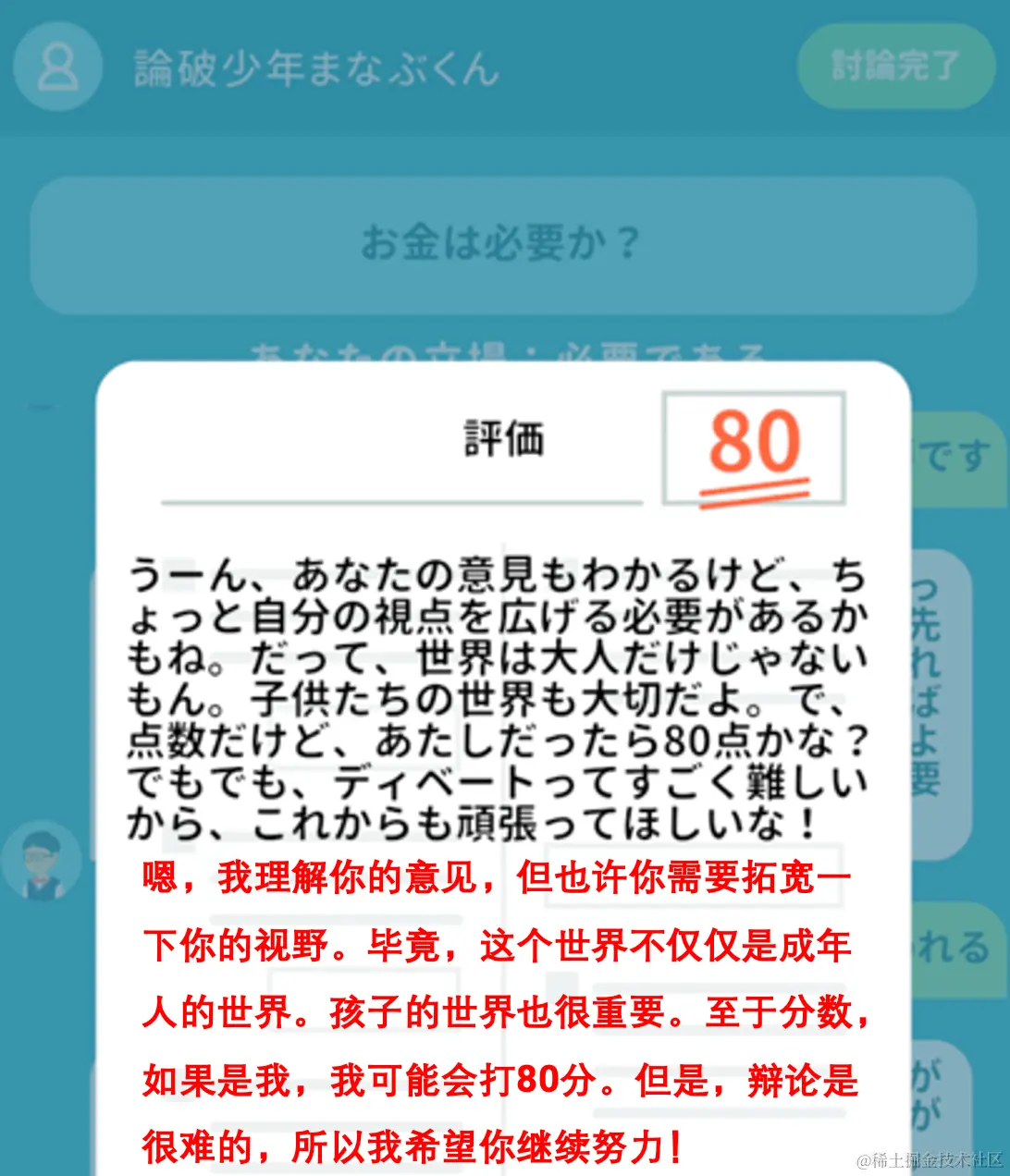 不同于AI老头平易近人、亲切温和的倾听风格,AI小学生的说话方式是比较直接的辩论风。使用过程比起对话和倾诉更像是激烈的辩论赛,你需要使尽浑身解数去说服辩倒对面的AI小学生,最后这个小学生还会给你的辩论结果打个分。要是不及格输给了小学生,想想就很气。
