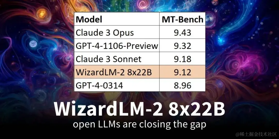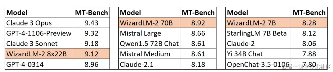 WizardLM-2系列模型在多个基准测试中表现出色。其中,7B版本在基准任务上与Qwen1.5-32B相当;70B版本超过了同类的GPT-4-0613;最高规格的8x22B版本则在MT-Bench上取得了9.12的高分,超越了所有现有的GPT-4版本。这些成绩彰显了微软在模型优化和多任务处理技术上的领先地位。