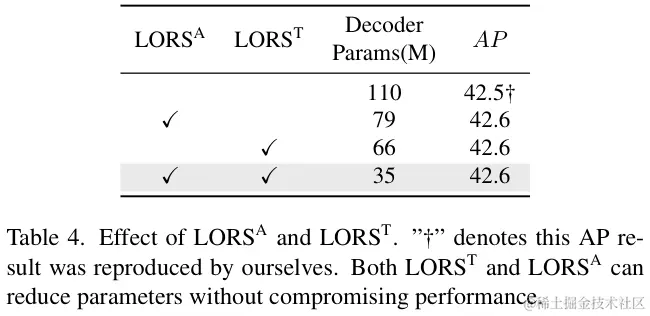 事实上,这三个组件共同占据了以ResNet-50为主干的AdaMixer模型总参数的大部分,同时它们也是增强模型性能的主要驱动力。综上,这也就是论文对它们进行LORS实验的动机。