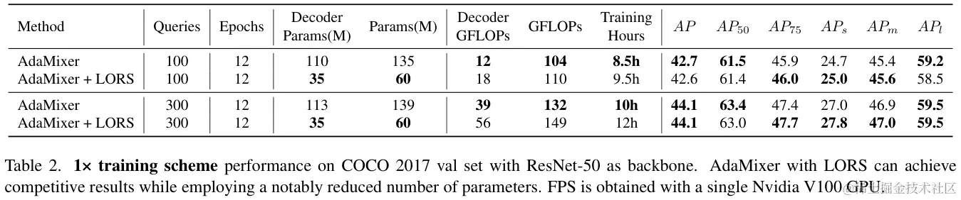 为了验证论文的想法,选择AdaMixer(一个强大的基于查询的对象检测器)作为实验对象。其堆叠的解码器中包含大量自适应和静态参数,是展示LORS有效性的理想候选者。自适应参数和静态参数的区别在于是否随着不同的输入而变化,而论文的目标是证明LORS可以有效减少两类参数的总体使用,同时保持模型的性能。对此检测器进行的广泛实验表明,LORS成功地减少了AdaMixer解码器中高达 70% 的参数,同时能够实现与其普通版本相当甚至更优越的性能。