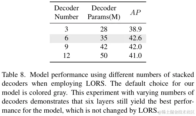 表 8 对结合LORS结构的最佳解码器层数进行实验对比。