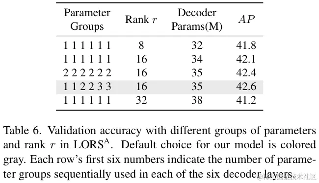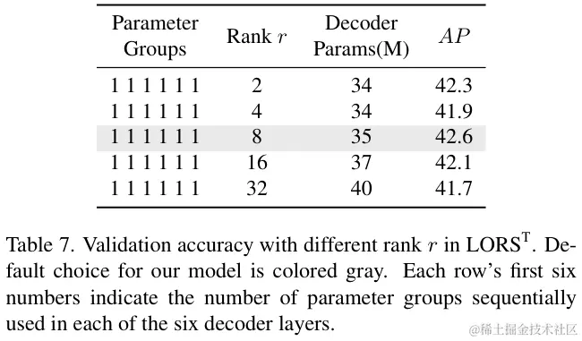 表 6 探索了自适应LORS的最佳参数组数量和秩 r 的值。