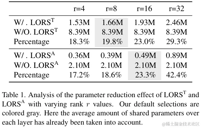 为了更直观地展示LORS的参数减少效果,在ASM设置 dq=256,d=64,h=128,K=2,h=256,Loutput 设置 d=2×128×128,K=1 的情况下,LORST 和 LORSA 对不同 r 值的参数减少情况如表 1 所示。