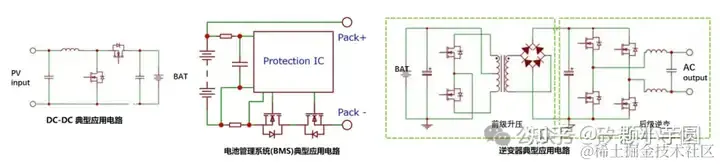 MOS在逆变器应用主要为前级升压和后级逆变两部分。前级升压将电池电压升至高压,后级逆变将高压逆变成交流电。MOS选型一般为电池电压的三倍以上,封装TO-220/TO-247。后级逆变常用拓扑结构为全桥逆变,一般选用650~1200V 高压MOS,封装TO-220/TO-247插件封装为主。
