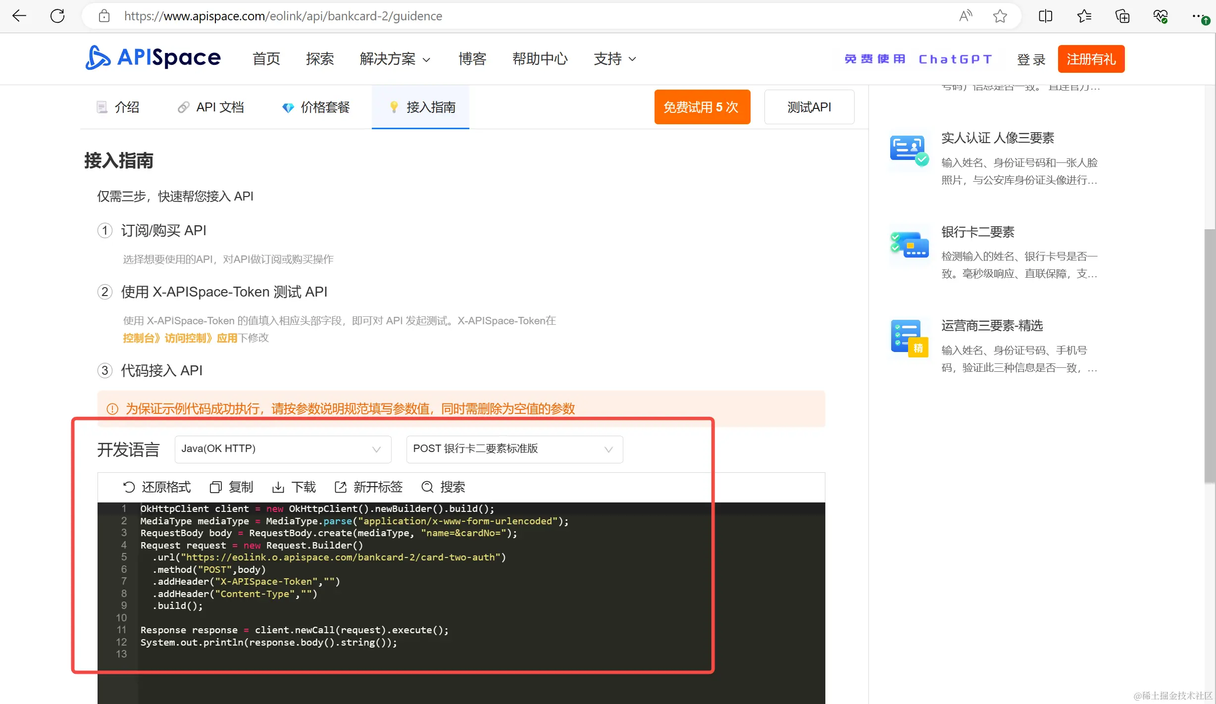 选择一个提供银行卡二要素验证服务的API提供商,并在该平台注册账户。这里使用的是 APISpace 的 银行卡二要素,检测输入的姓名、银行卡号是否一致。毫秒级响应、直联保障,支持全国所有银联卡。除了银行卡二要素,还提供了银行卡三要素、银行卡四要素核验API。