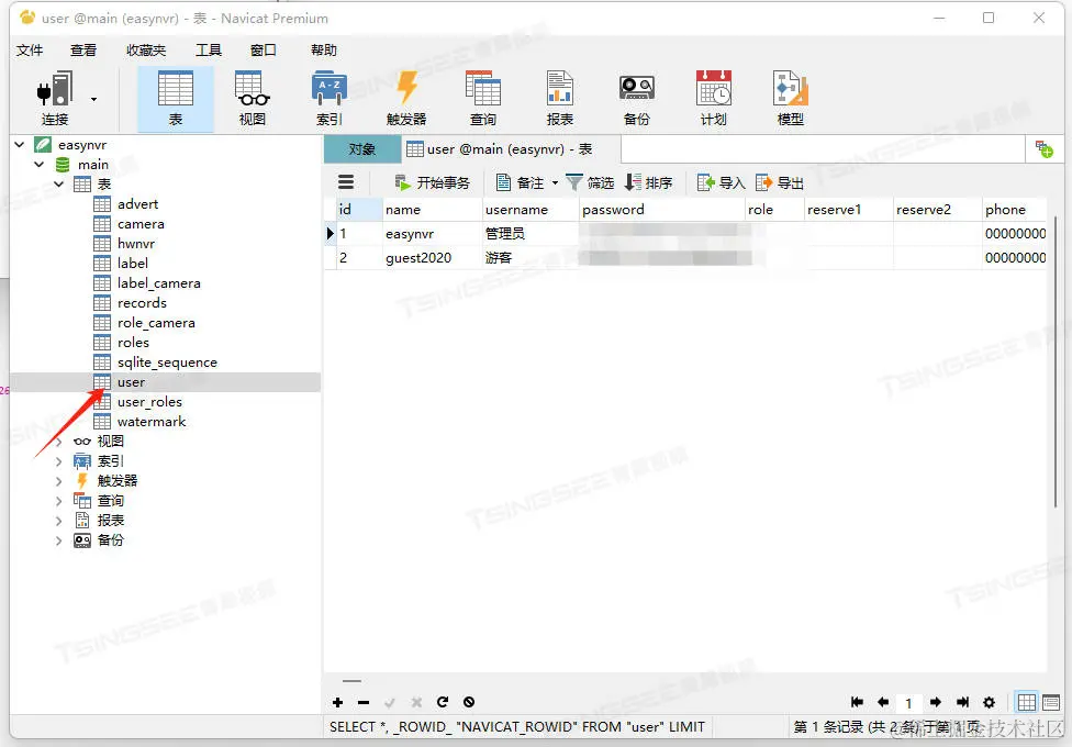 1) 用navicat打开EasyNVR的数据库;