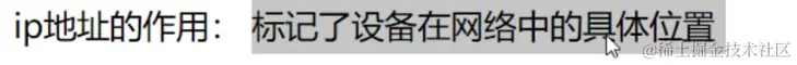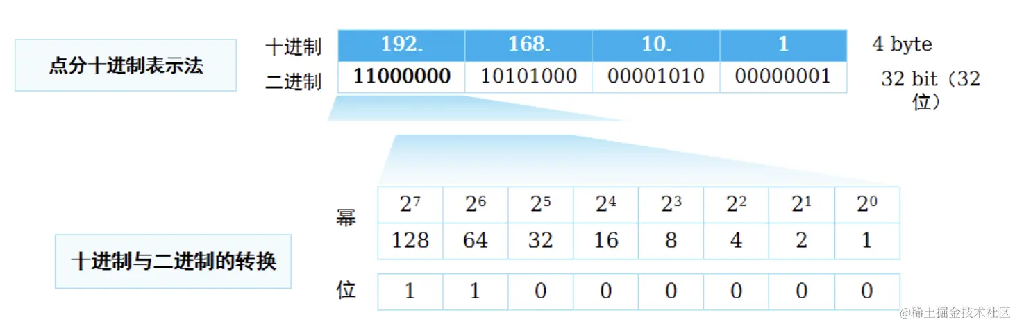 在网络中用来标识设备的具体地址,数据需要通过此进行寻址传输, 我们可以通俗把ip地址想成家庭地址 在电脑里,我们还有一个标识叫mac地址 但是如果通过mac地址寻址传输比较复杂,为了简化流程,加入了ip地址方便操作 我们可以通俗把mac地址想成身份证它是唯一的,出厂就有 关于mac地址和ip地址可以这样理解:我们找人一般是找家庭地址,然后确认身份证,如果直接身份证找人太麻烦了。 按照TCP/IP协议规定,IP地址用二进制来表示,每个IP地址长32bit,比特换算成字节,就是4个字节。