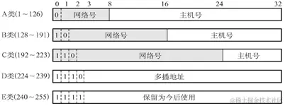 IP地址根据网络ID的不同分为5种类型,A类地址、B类地址、C类地址、D类地址和E类地址。