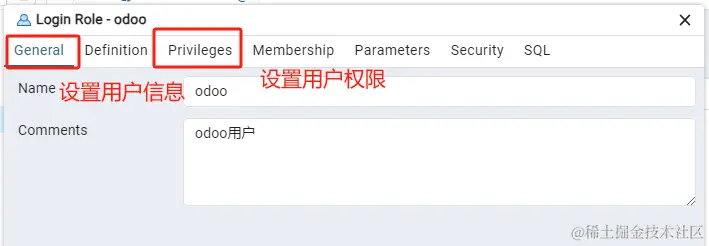 - 登陆pgadmin,创建新的登陆用户 odoo