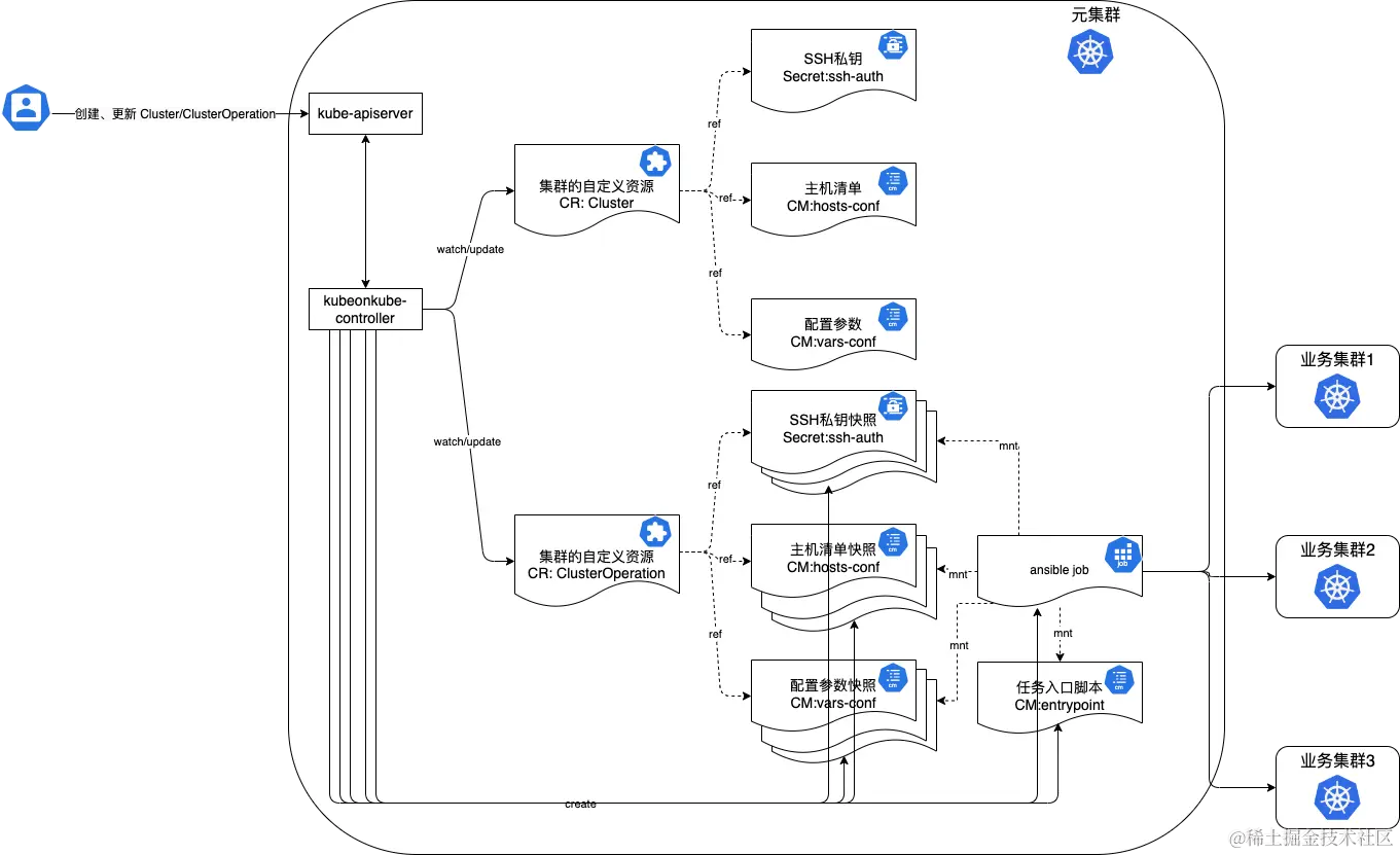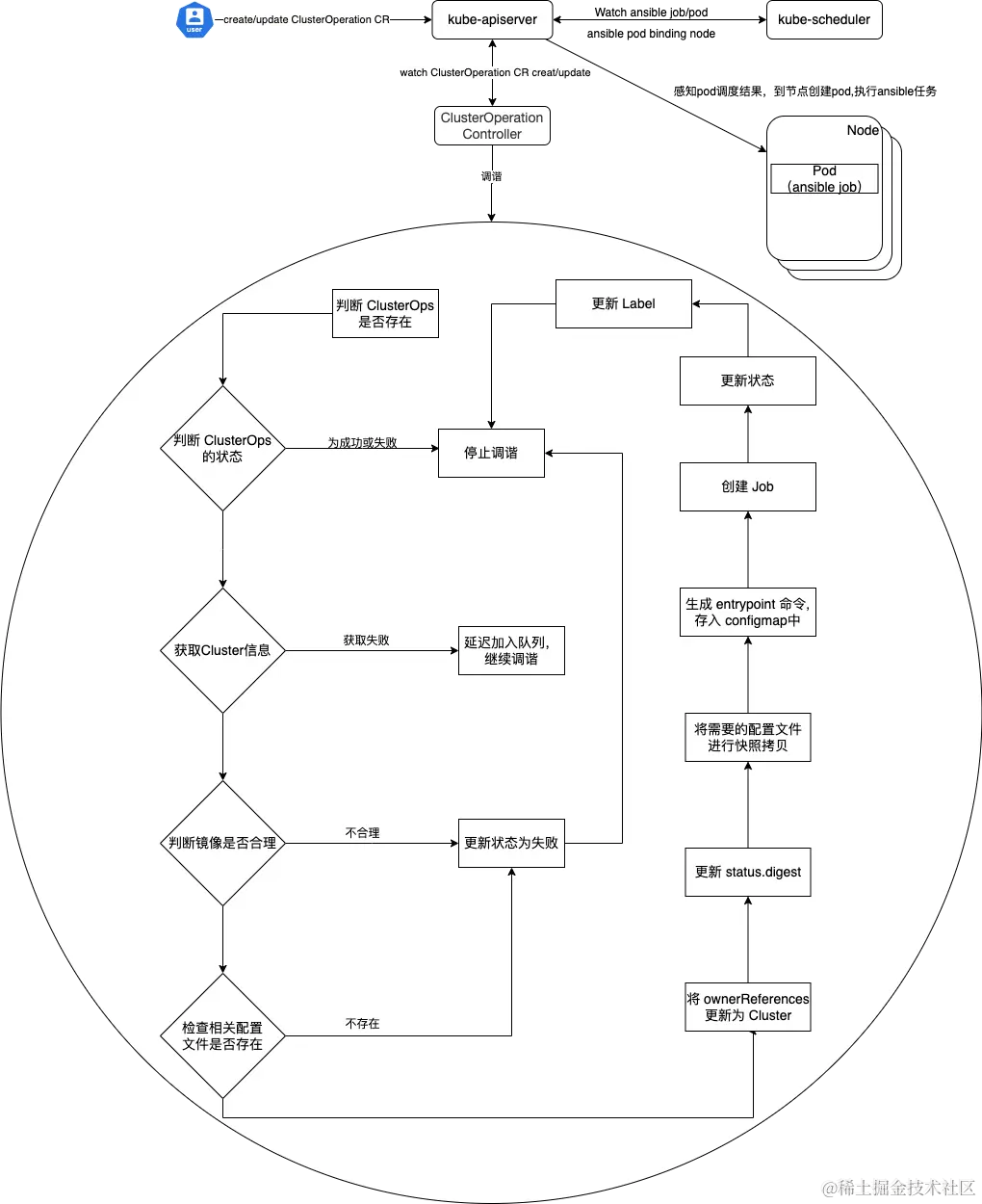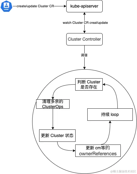 Cluster Objects。唯一标识一个集群,拥有集群节点的访问信息、类型信息、部署参数信息,并且关联所有对此集群的操作(ClusterOperation Objects); - ClusterOperation Controller: 监视