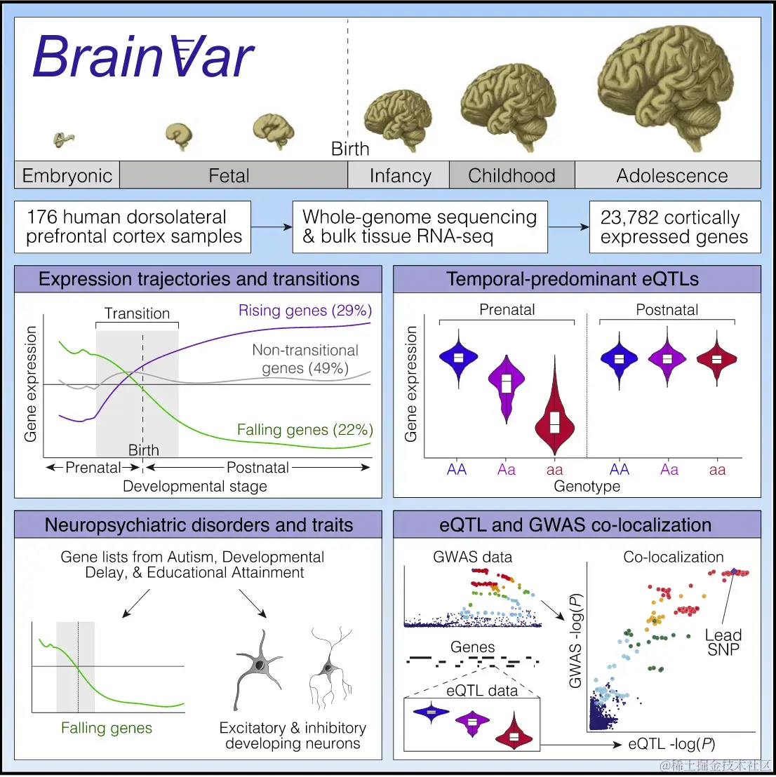 基因表达水平因发育阶段、细胞类型和大脑区域而异。基因组变异也会导致表达变异,一些神经精神疾病位点可能通过这种机制发挥作用。为了研究这些关系,研究者推出了 BrainVar,一种独特的资源,对 176 名产前和产后发育个体的背外侧前额叶皮层进行配对全基因组和大量组织 RNA 测序。在该研究中,确定了在整个发育过程中或主要在产前或产后阶段不断改变基因表达(表达数量性状位点 [eQTL])的常见变异。“恒定”和“时间主导”eQTL 都富含与神经精神特征和疾病相关的基因座,并与特定变异共定位。超过 12,000 个基因的表达水平在协调一致的胎儿晚期过渡中上升或下降,过渡基因富含细胞类型特异性基因和神经精神风险位点,强调了对发育轨迹进行编目在理解皮质生理学和病理学方面的重要性。
