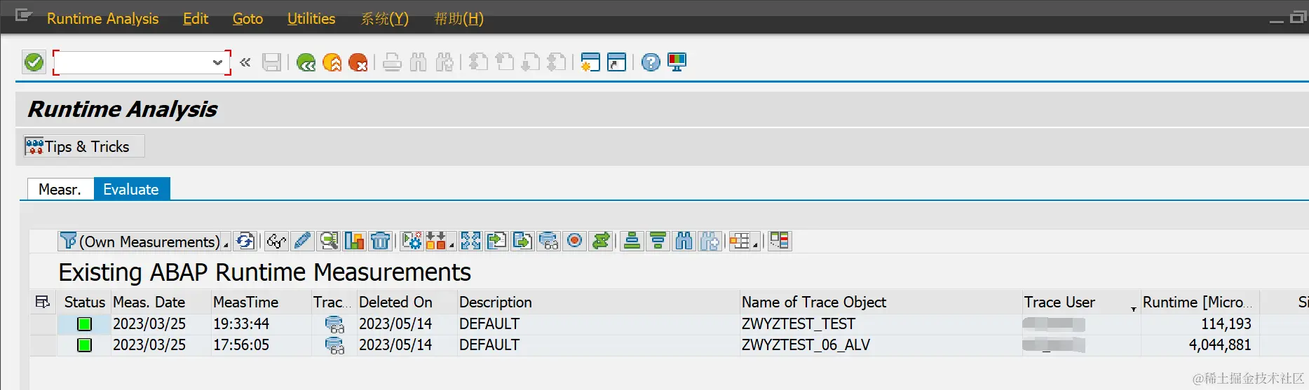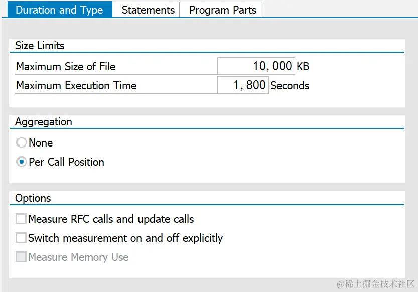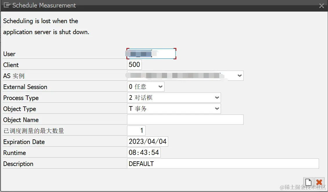 Object Type:Transaction, Report, Function等,与下面的对象配合,确定相应的启动方式。Object Name:tcode, 程序名, 功能函数名。已调度测量的最大数量:在统计时间有效期内,最多记录的性能跟踪次数Expiration Date:创建时间(年月日)Run time:创建日期(小时/分钟/秒数)Description:短文本描述