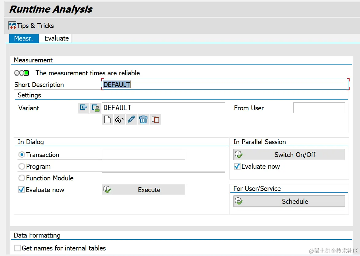 SAT是SAP提供的用来替代SE30的程序性能优化分析工具( runtime analysis),功能比SE30更加强大,使用起来也很方便。它的初始屏幕如下图所示:
