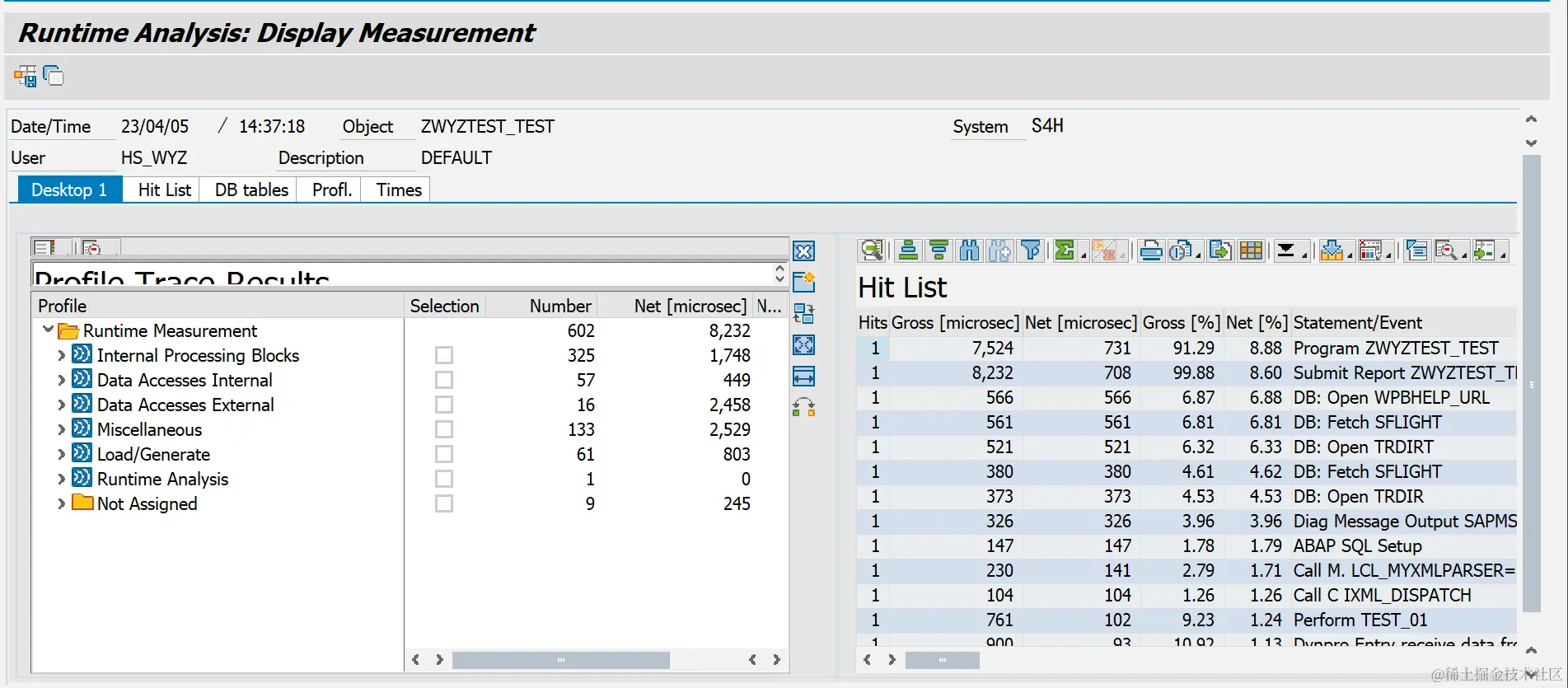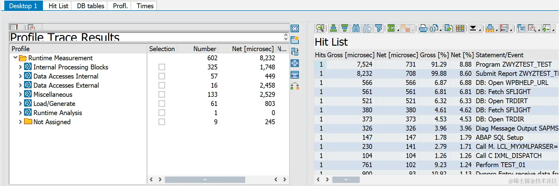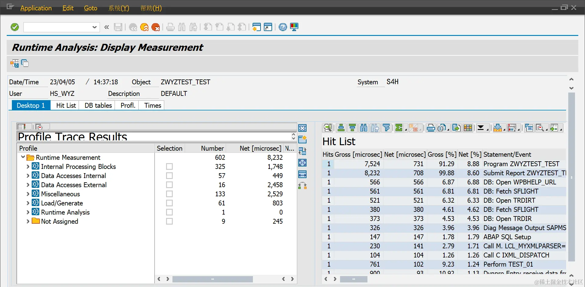 Hits:被调用的次数。Gross[microsec]:该语句,子程序以及被其调用的子程序,语句所消耗的时间。(以微秒记)Net[microsec]:该语句,子程序不包括被其调用的子程序,语句的消耗时间。(以微秒记)Gross[%]:显示为 Gross Time 在总时间中占用的时间比。Net [%]:显示为 Net time 在总的时间中占用的时间比。Statement/Event:调用事件,与Profile窗口里的事件相对应Program Called:程序名或事务码名称(通常情况下与Calling Program相同)Calling Program:程序名或事务码名称(通常情况下与Program Called相同)