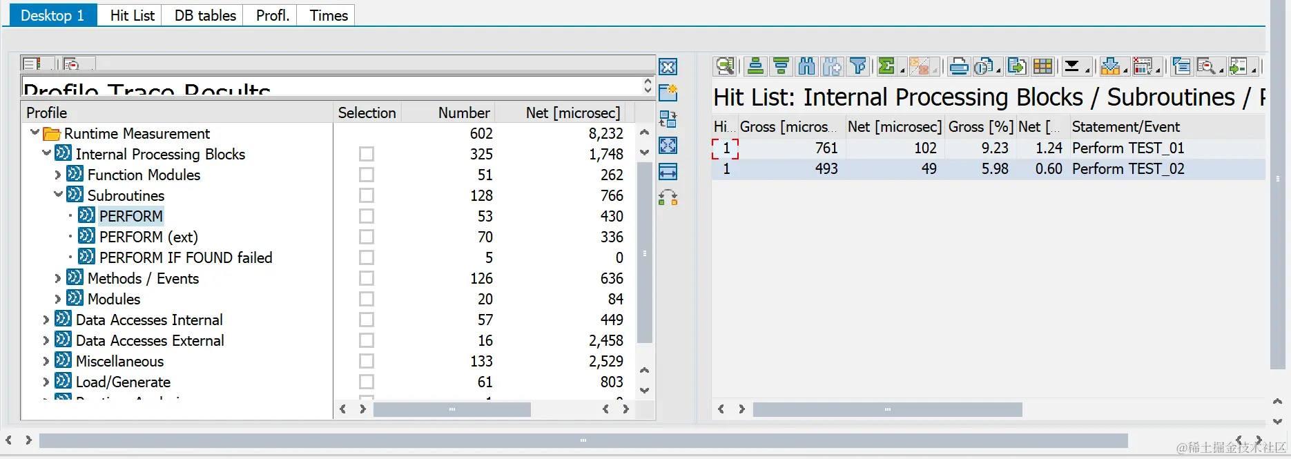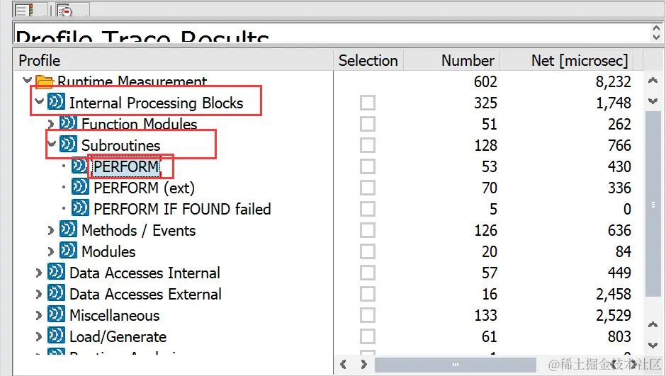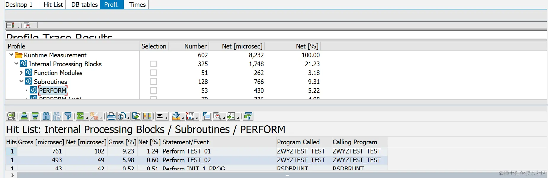 Hits:被调用的次数。Gross[microsec]:该语句,子程序以及被其调用的子程序,语句所消耗的时间。(以微秒记)Net[microsec]:该语句,子程序不包括被其调用的子程序,语句的消耗时间。(以微秒记)Gross[%]:显示为 Gross Time 在总时间中占用的时间比。Net [%]:显示为 Net time 在总的时间中占用的时间比。Statement/Event:调用事件,与Profile窗口里的事件相对应Program Called:程序名或事务码名称(通常情况下与Calling Program相同)Calling Program:程序名或事务码名称(通常情况下与Program Called相同)