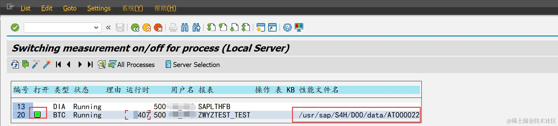 (八)SAT程序开始跟踪,打开字段变为绿灯表示正在跟踪报表程序,并且生成了一个性能文件名