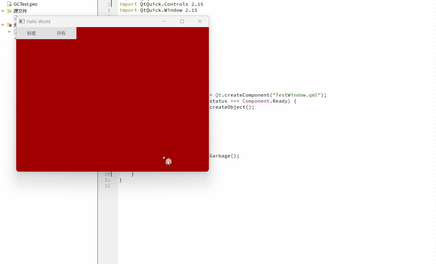 可以看到,创建按钮动态创建了一个窗口,而回收按钮则直接运行 Qml 的垃圾收集器。