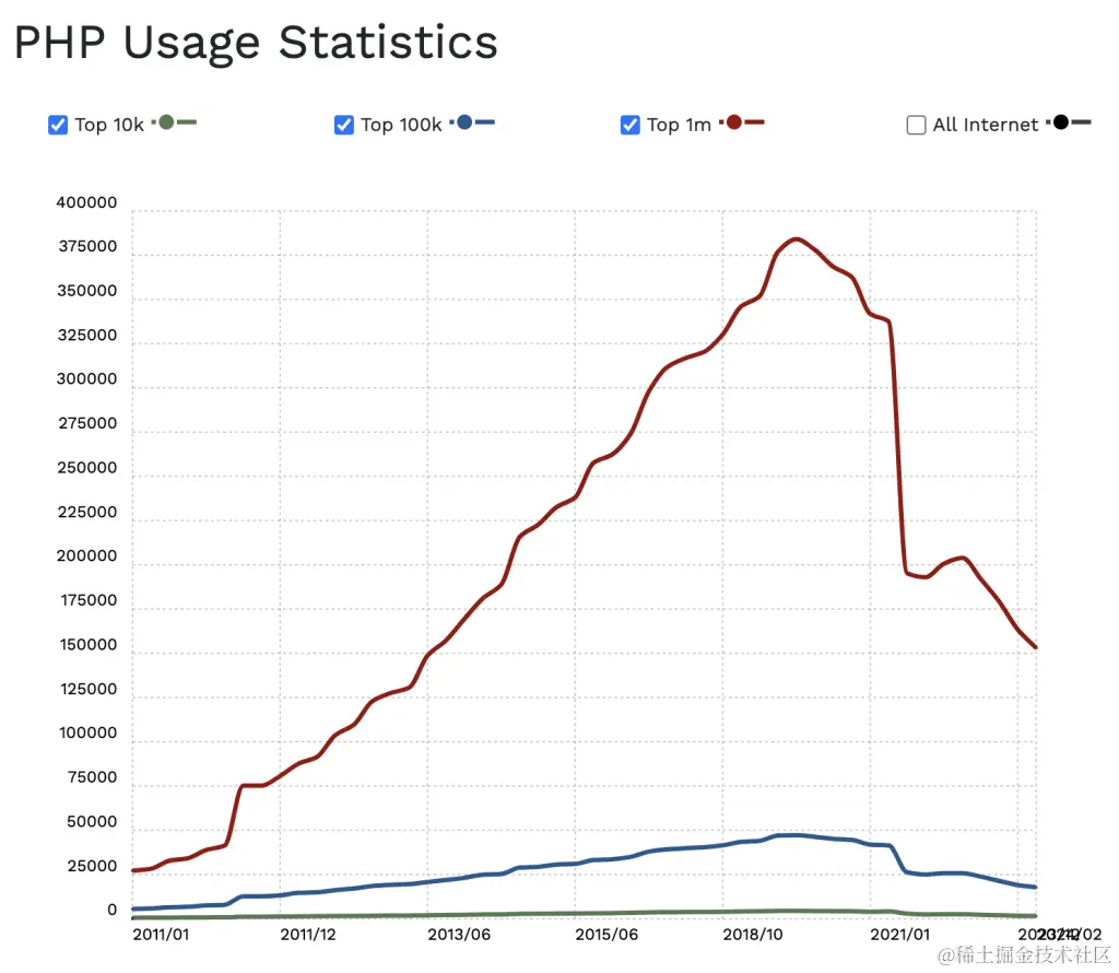 这种下降在 BuiltWith 中表现得最为明显,其中 PHP 的受欢迎程度增长曲线在 2020 年底开始下降。