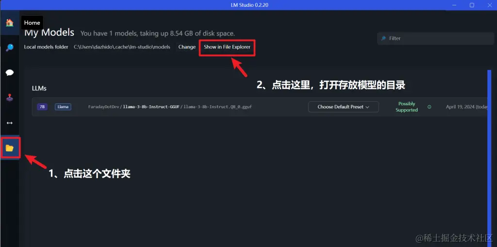 3:桌面双击打开LM-Studio快捷方式然后通过以下两步,打开存放模型的文件夹,然后将解压包里的FaradayDotDev文件,整个复制到模型文件夹内。