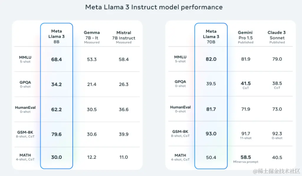 Meta(也就是脸书)发布了目前最强的开源大模型Llama 3,AI圈又嗨起来了,它有两款不同的参数模型——Llama 3 8B与Llama 3 70B。性能再次突破,基本全面碾压同类参数的选手,甚至能越级和GeminiPro等打的有来有回。