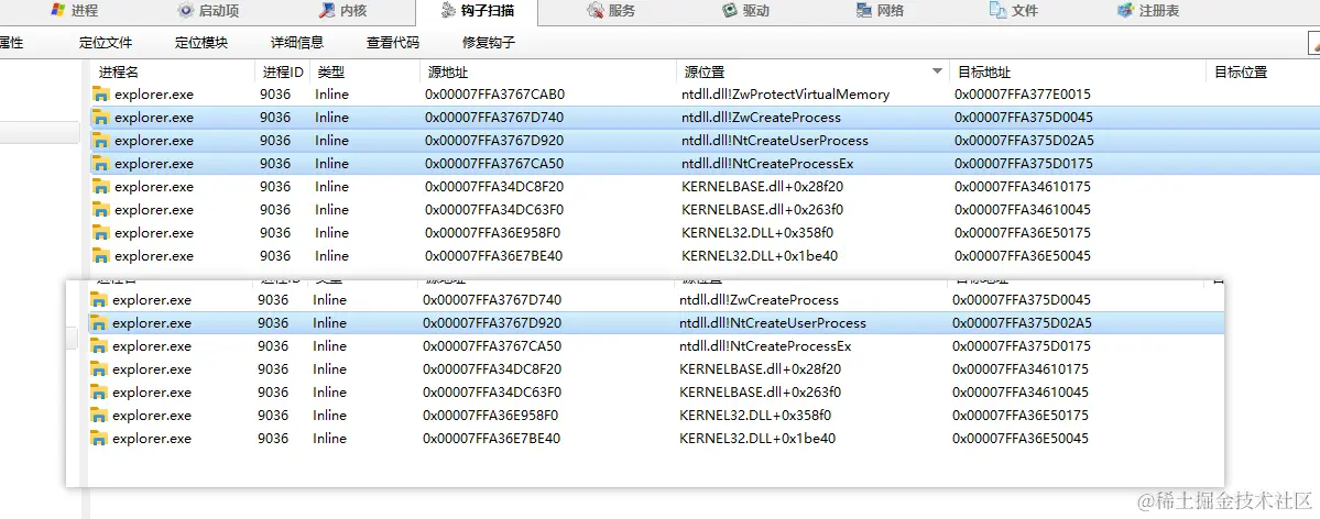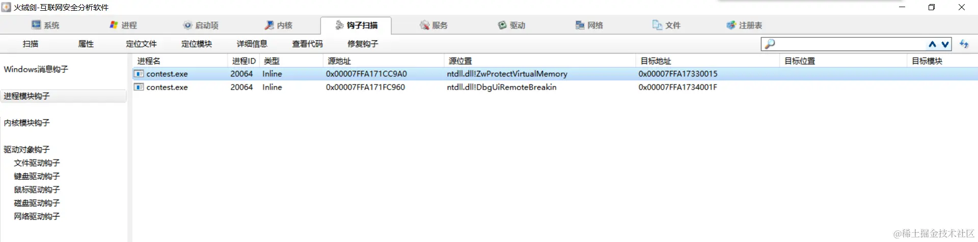 但是在写内存的时候,发现 VirtualProtect 一直调用失败,拿火绒剑扫了一下,发现 VirtualProtect 被下了钩子。