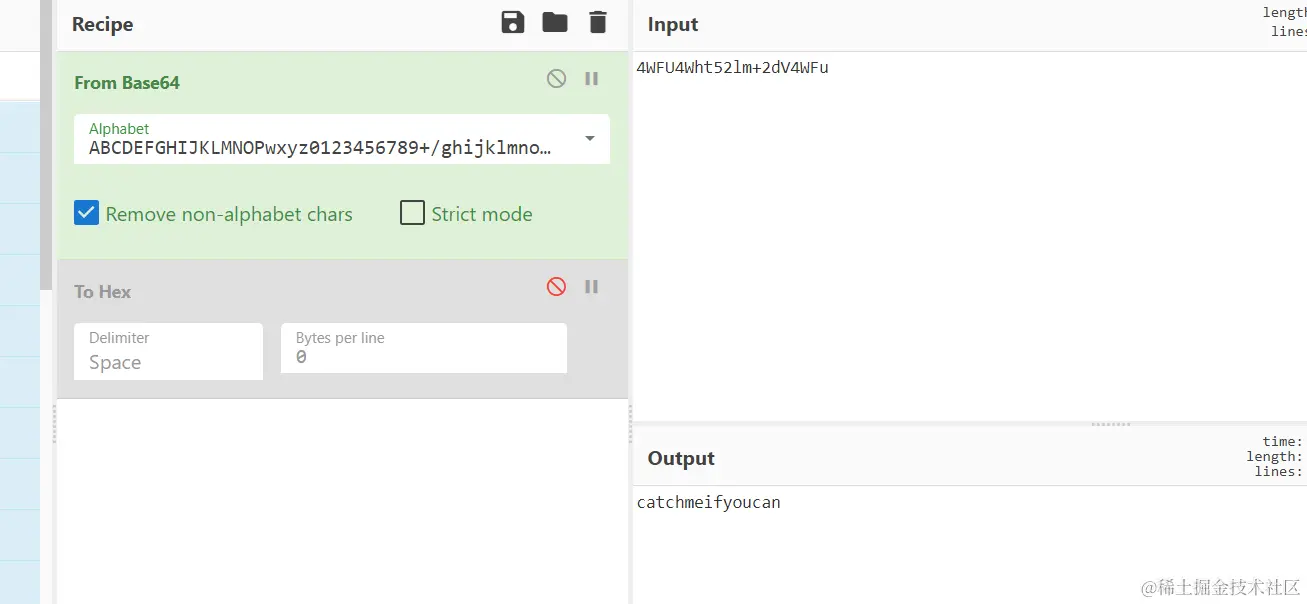 经过base64解码发现,其中一个是 catchmeifyoucan + id,一个是不可见的字符,而且刚好等于上面不可见字符的补集。