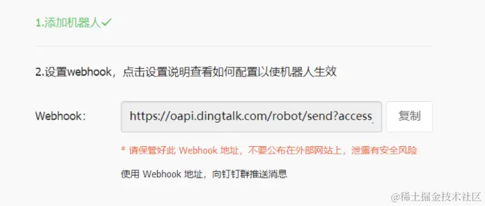 在打开的添加机器人页面输入机器人名字,选择要接收报警的钉钉群 ,设置机器人头像。根据需要勾选安全设置等就可以,点击完成之后,在页面拷贝出 Webhook 地址保存好,向这个地址发送 HTTP POST 请求,设置的 SkyWalking 钉钉报警群便能收到钉钉报警消息,如下图所示: