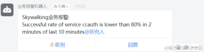 配置好之后我们可以看到设置报警的钉钉群“SkyWalking 钉钉报警”出现了报警机器人消息,如下图所示: